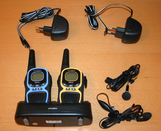 FLYTALK XTRA. Free use PMR446 handheld, without licence. Includes a complete accesories kit: 2 handhelds, 2 NiMh batteries, 2 earphones, 2 chargers and 1 desktop double charger. Has excellent features, very good sensibility, silencer with a correct level and functions as CTCSS, vibrator, dual watch, hands free, scanner and chronometer. Besides has a clock, showing the hour even if it's switched off.